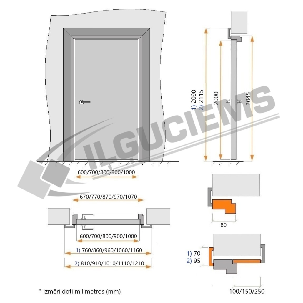 Additional elements: architraves, frame extension boards, threshold, hardware (handles, thumbturns, cylinders, etc.)